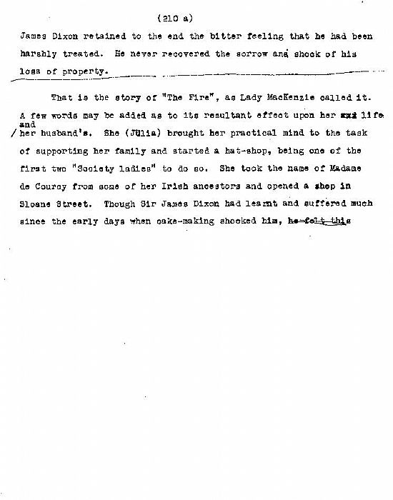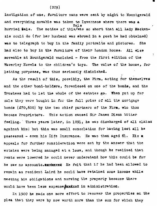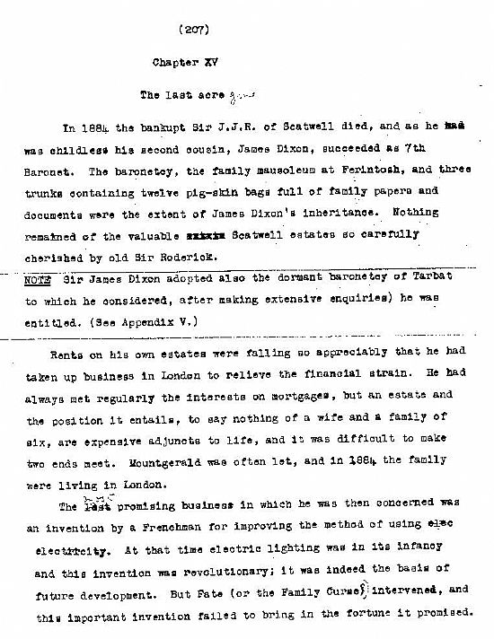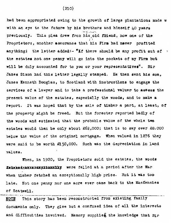 “The last acre gone” is the last chapter of “Mackenzies of Scatwell” or “Times deceased”. Mr Jackson provided us with Xerox copies of those 5 pages entitled “The last acre gone”. In time we may be able to compare them with the equivalent in “Times Deceased”. The last sentence in "Times Deceased" refers to "last acre gone".
